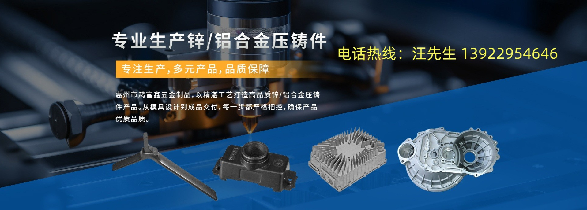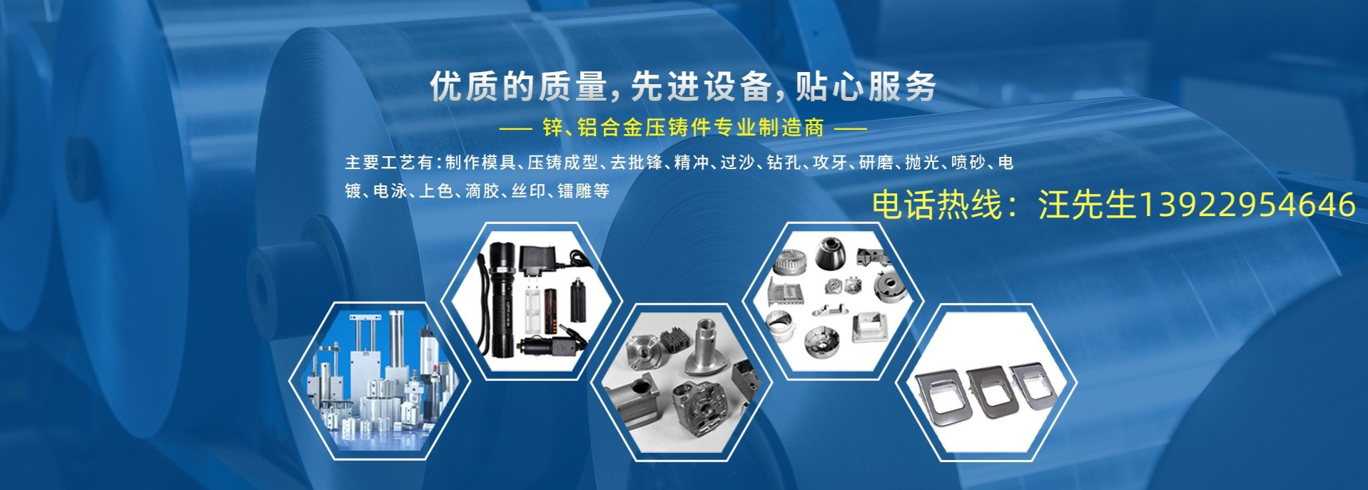 公司主要工藝有:制作模具、壓鑄成型、去批鋒、精沖、過砂、鉆孔、攻牙、研磨、拋光、噴砂、電鍍、電泳、上色、滴膠、絲印、鐳雕等。"/>