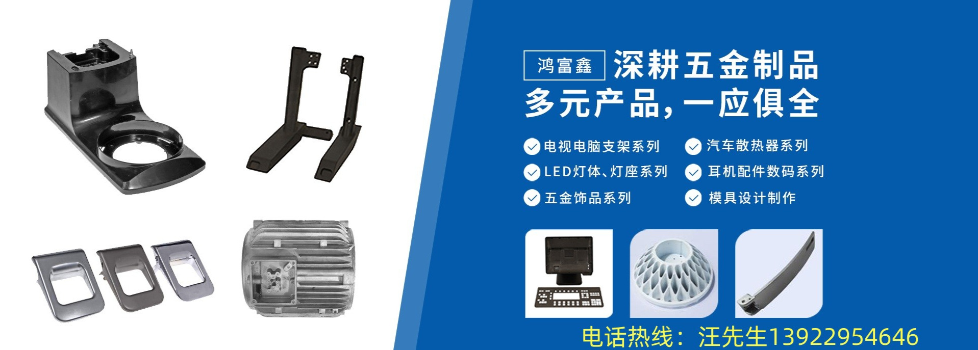 公司主要產(chǎn)品有電視電腦支架系列、汽車散熱器系列、LED燈體 燈座系列、耳機配件數(shù)碼產(chǎn)品系列、五金飾品系列、模具設計制作等,另外我司為滿足廣大客戶需求于2017年1月份正式投產(chǎn)成立了新公司,并命名為東莞市鴻富萊精密科技有限公司。